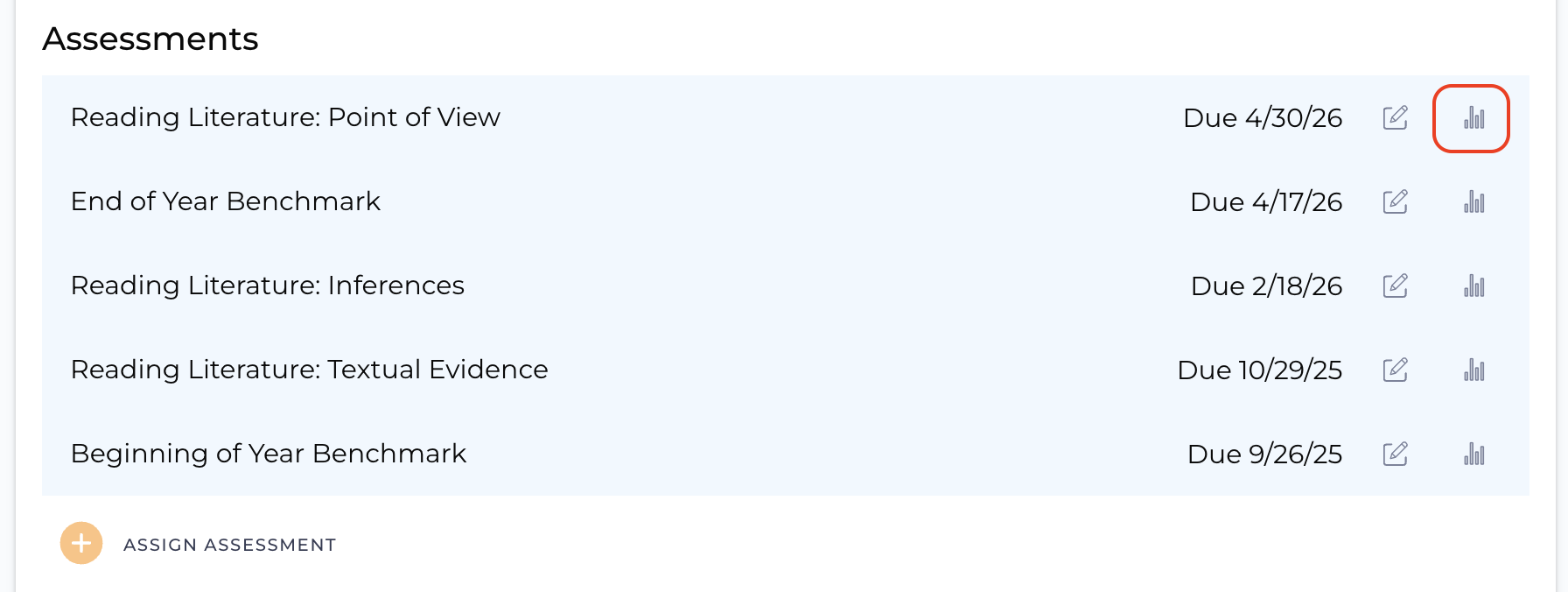 Assessment results can be accessed by navigating through the following of your Portal: Classes —> [Select Class] —> Assessments —> Click on the bar graph icon at the far right of the desired assessment.