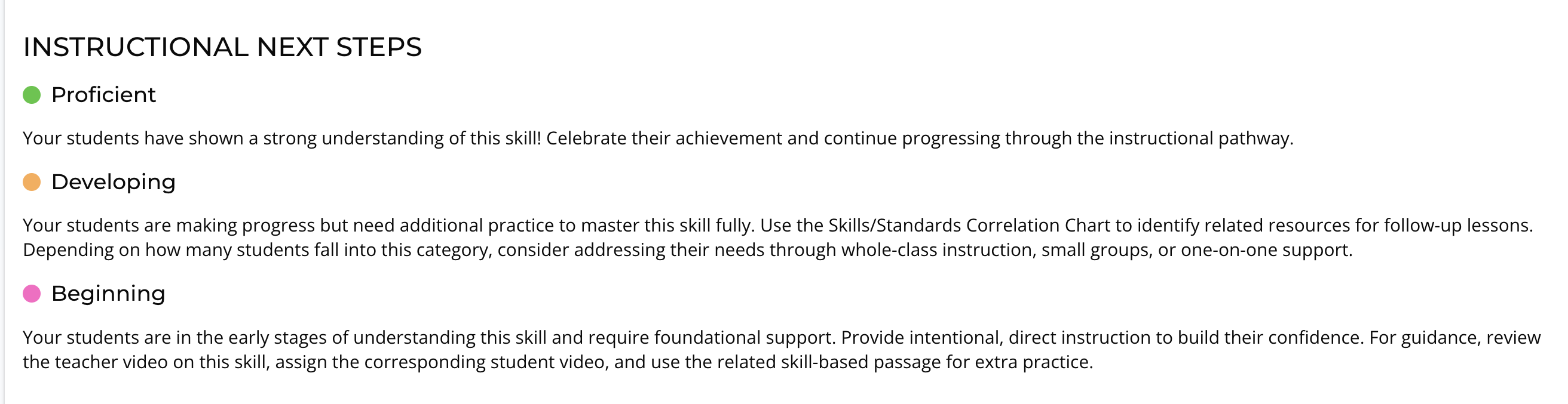 The Class Summary will graph your all of your students’ data by their overall results as well as by individual skills into the following categories, and will suggest next steps: