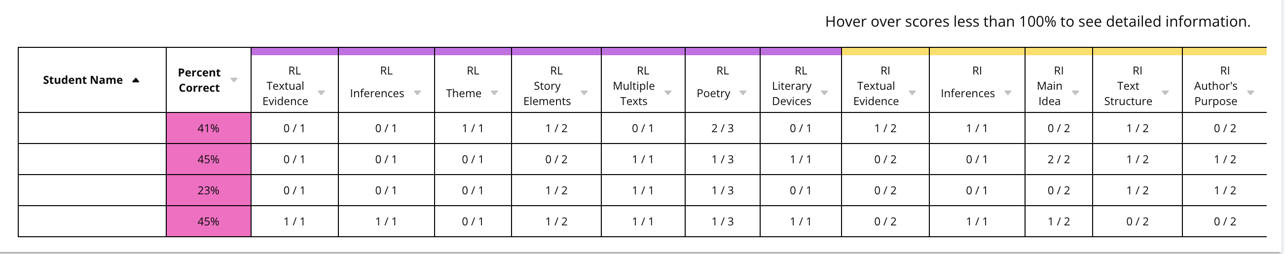 - Student names, Percent Correct, and individual skills can be sorted by clicking on each arrow (this is helpful for grouping).