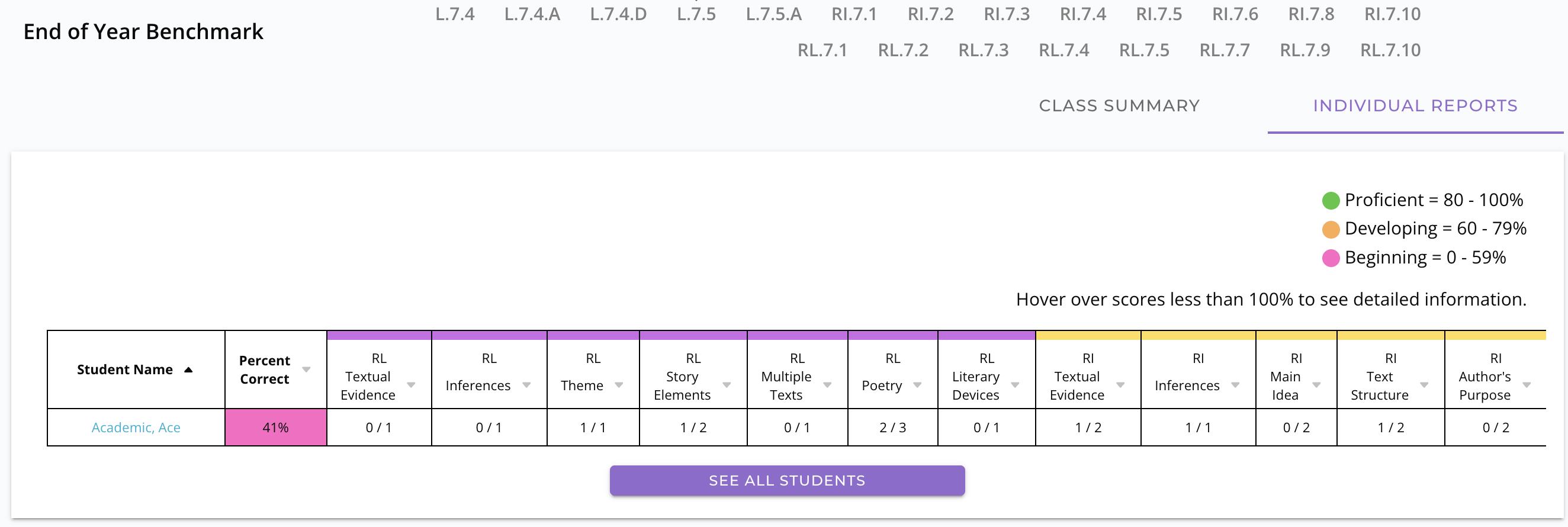 Individual Reports will chart each student’s percentage correct into the same categories as above as well as their chart their individual results for each skill.