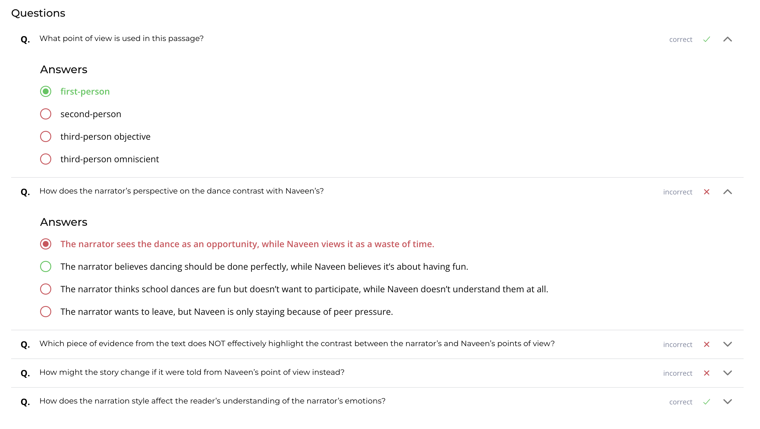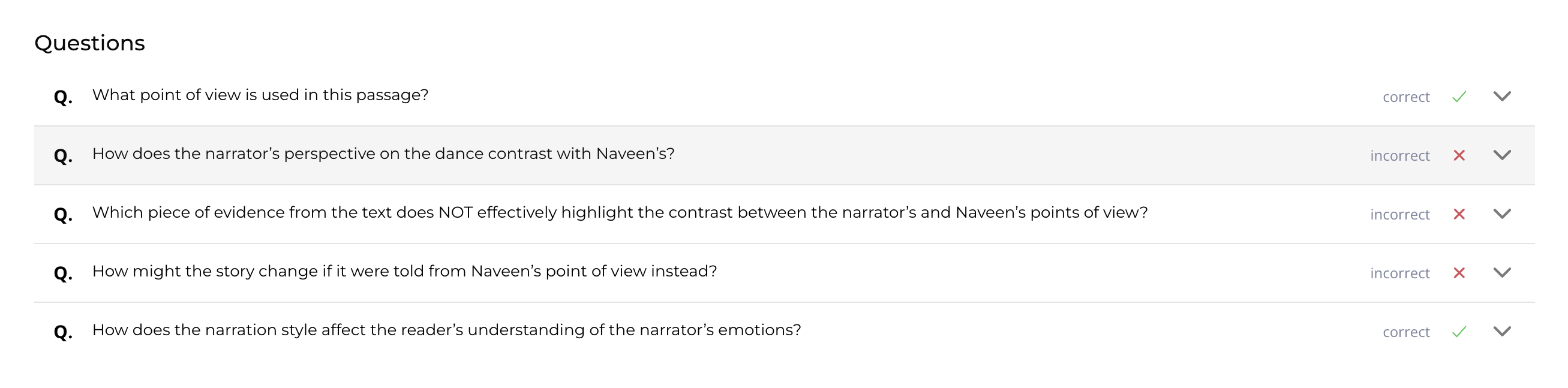 - Hover over scores to see detailed information, such as percentage of incorrect answers, or percentage of unanswered questions.